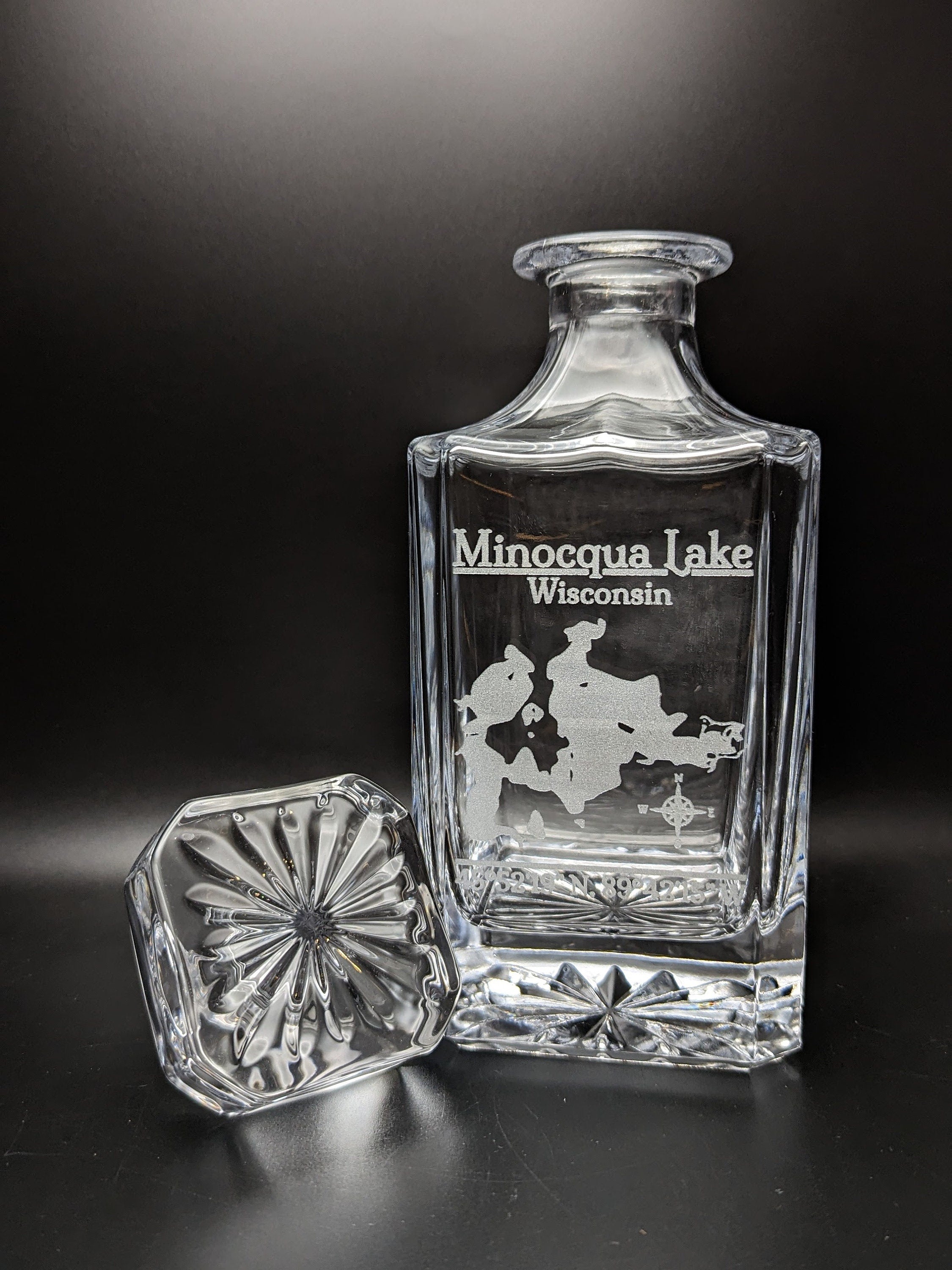 Choose a custom etched whiskey decanter, personalized to your preferences, including the option to etch your favorite lake. Additional customization options are available for a fee - simply send us a message. Experience our fast shipping and excellent customer service.