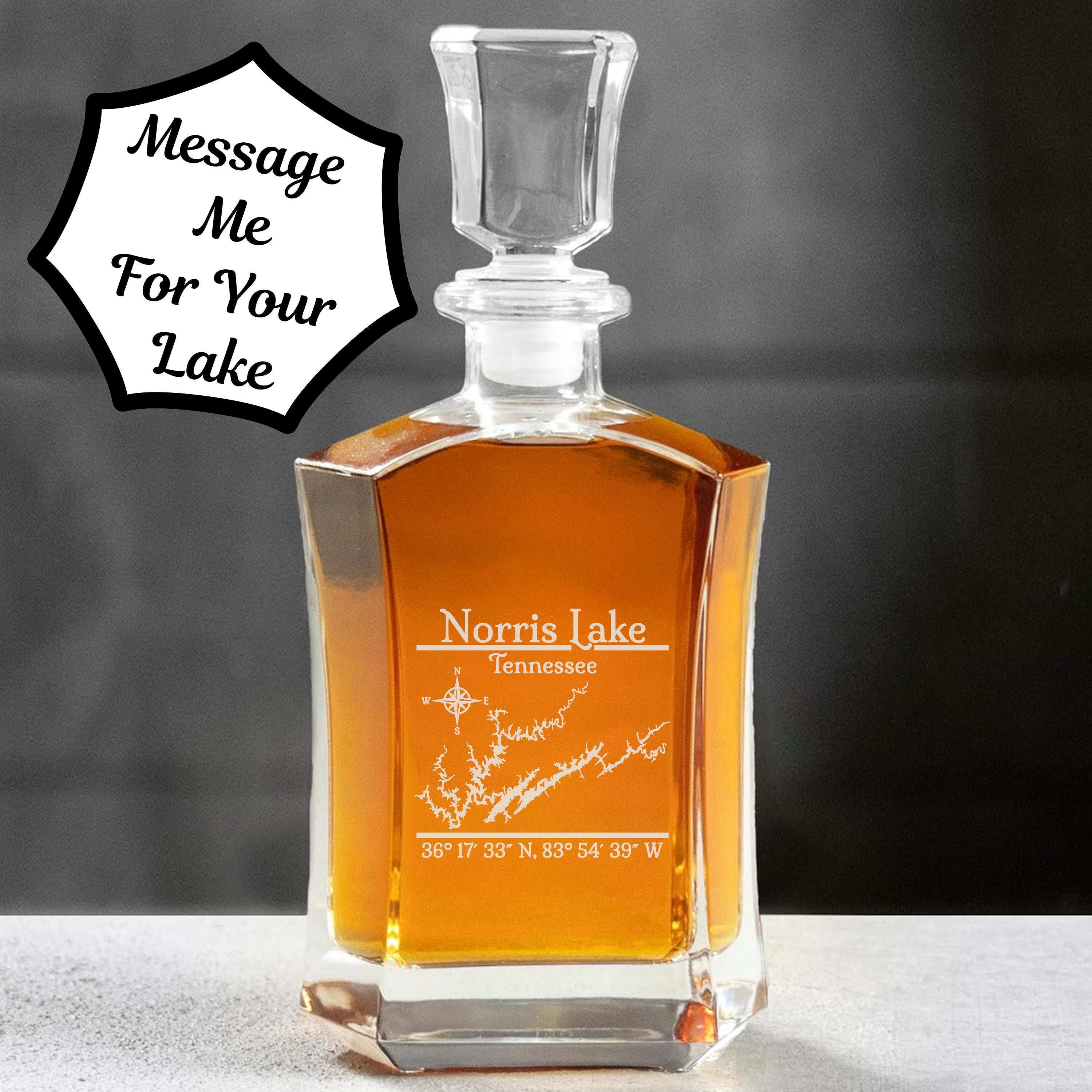 Choose a custom etched whiskey decanter, personalized to your preferences, including the option to etch your favorite lake. Additional customization options are available for a fee - simply send us a message. Experience our fast shipping and excellent customer service.