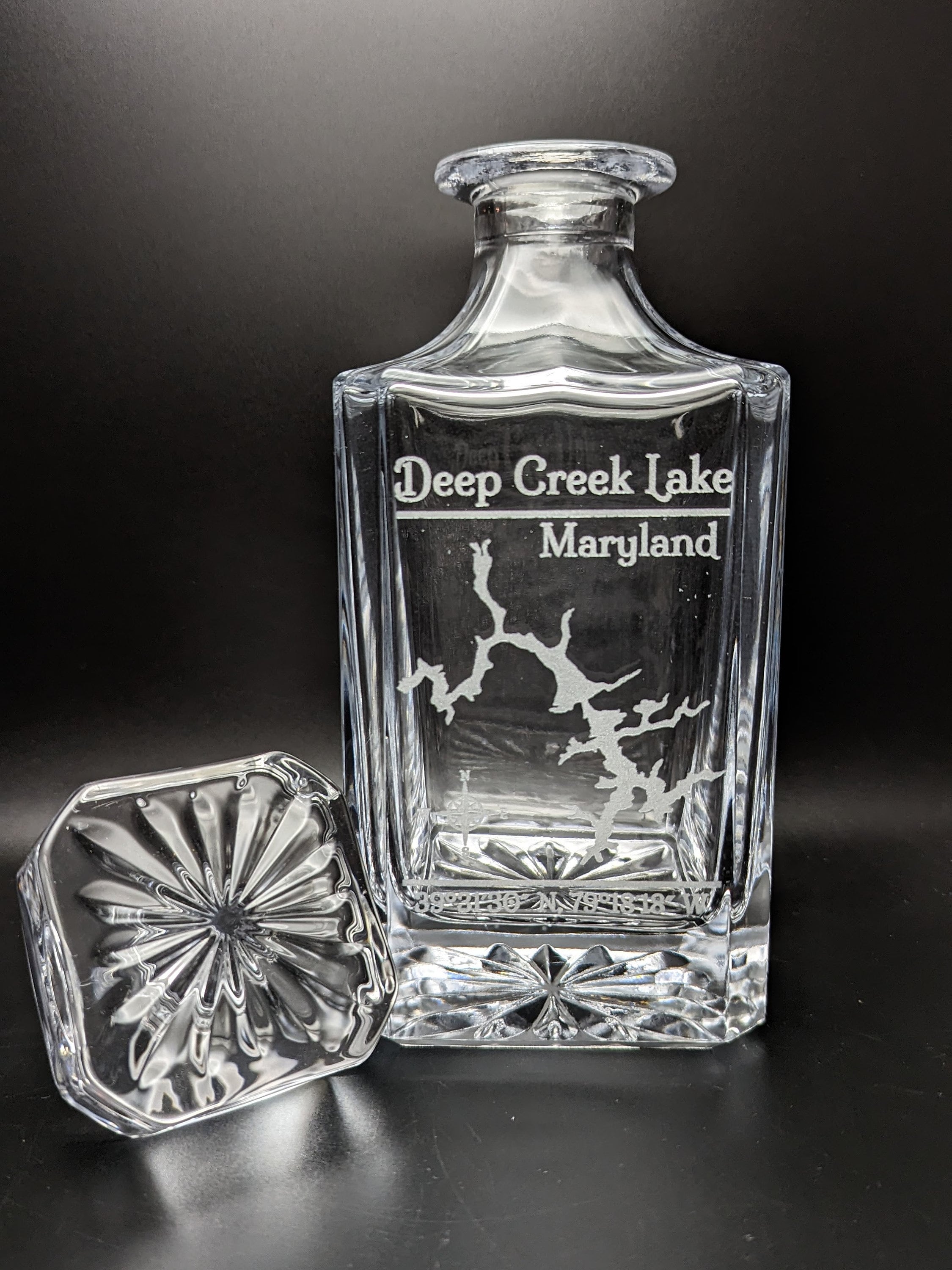 Choose a custom etched whiskey decanter, personalized to your preferences, including the option to etch your favorite lake. Additional customization options are available for a fee - simply send us a message. Experience our fast shipping and excellent customer service.